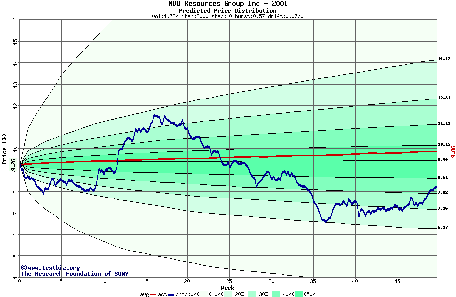 The following graph plots the year-to-date performance of the stock for 2001 compared to the probability calculated by a random walk model.