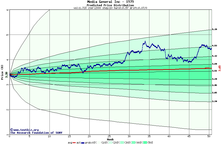 The following graph plots the year-to-date performance of the stock for 1979 compared to the probability calculated by a random walk model.