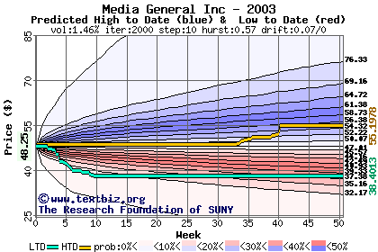 The high to date and low to date prices of the stock plotted against a random walk model for 2003 (what's this?).