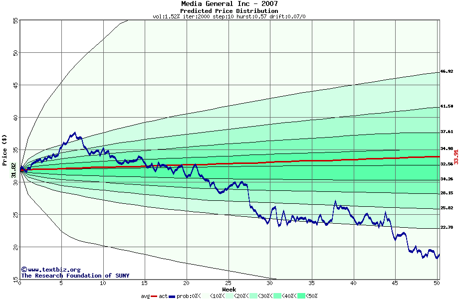 The following graph plots the year-to-date performance of the stock for 2007 compared to the probability calculated by a random walk model.