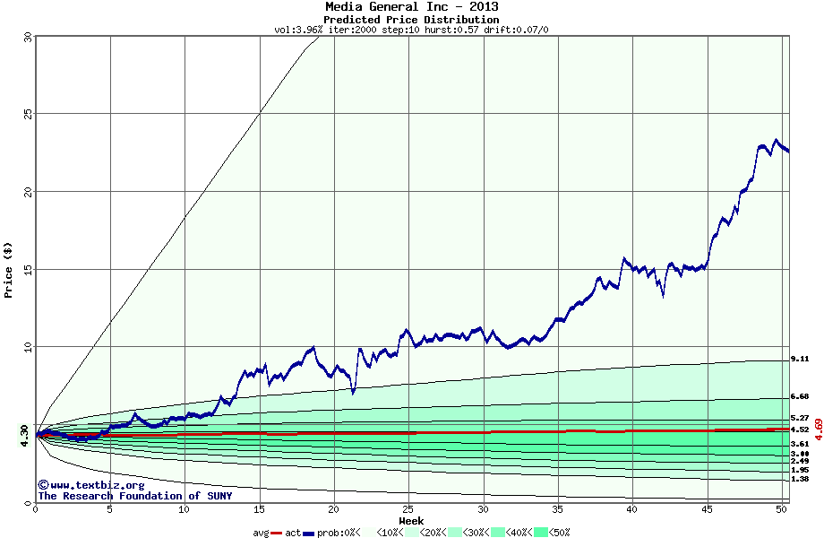 The following graph plots the year-to-date performance of the stock for 2013 compared to the probability calculated by a random walk model.