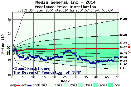 The high to date and low to date prices of the stock plotted against a random walk model for 2014 (what's this?).