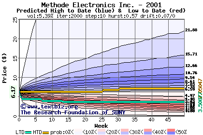The high to date and low to date prices of the stock plotted against a random walk model for 2001 (what's this?).