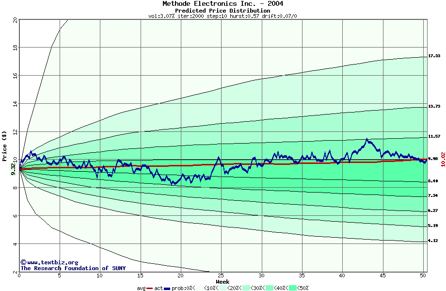 The following graph plots the year-to-date performance of the stock for 2004 compared to the probability calculated by a random walk model.
