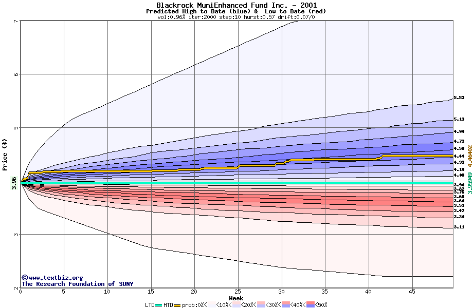 The high to date and low to date prices of the stock plotted against a random walk model for 2001 (what's this?).