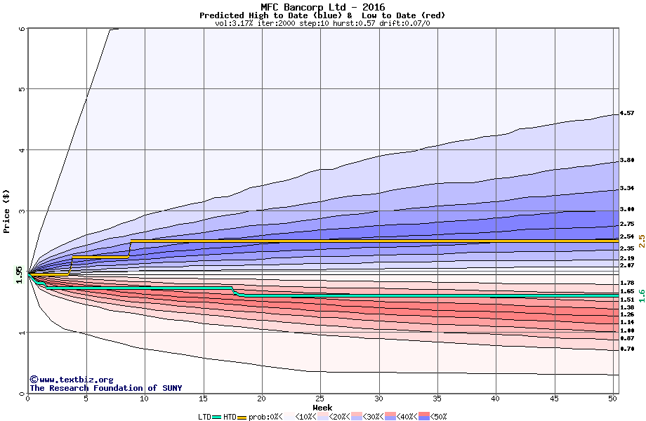 The high to date and low to date prices of the stock plotted against a random walk model for 2016 (what's this?).