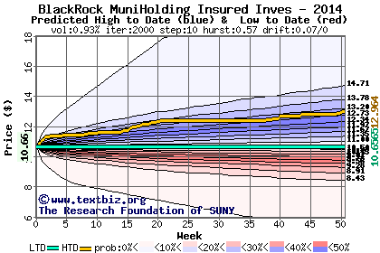 The high to date and low to date prices of the stock plotted against a random walk model for 2014 (what's this?).