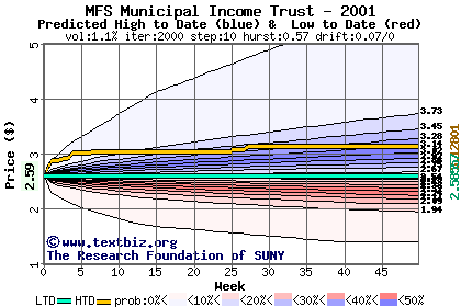 The high to date and low to date prices of the stock plotted against a random walk model for 2001 (what's this?).