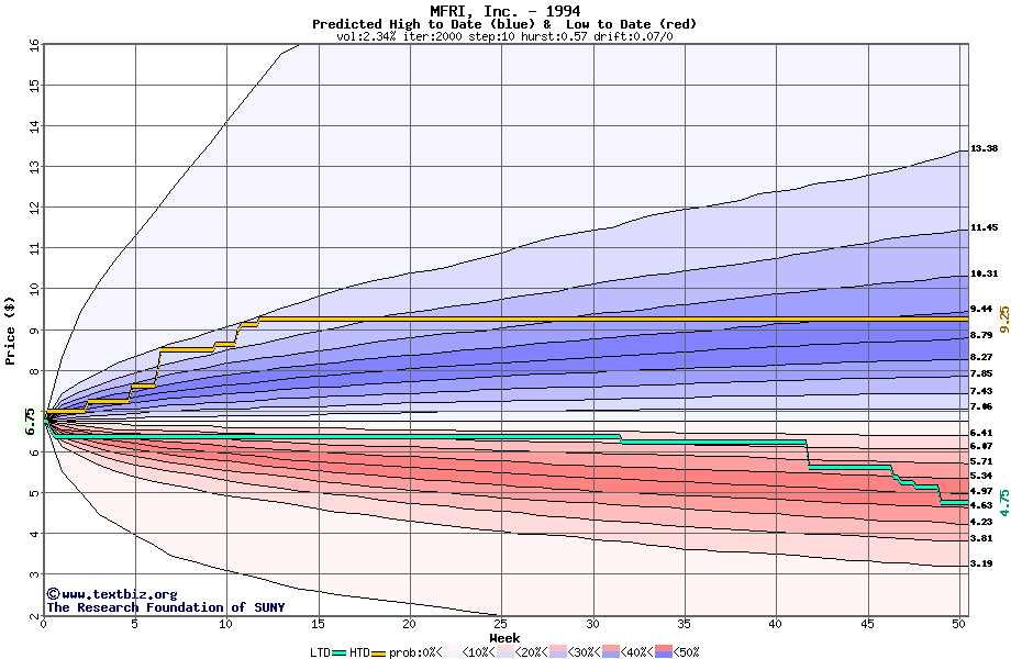 The high to date and low to date prices of the stock plotted against a random walk model for 1994 (what's this?).