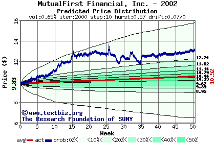 The high to date and low to date prices of the stock plotted against a random walk model for 2002 (what's this?).