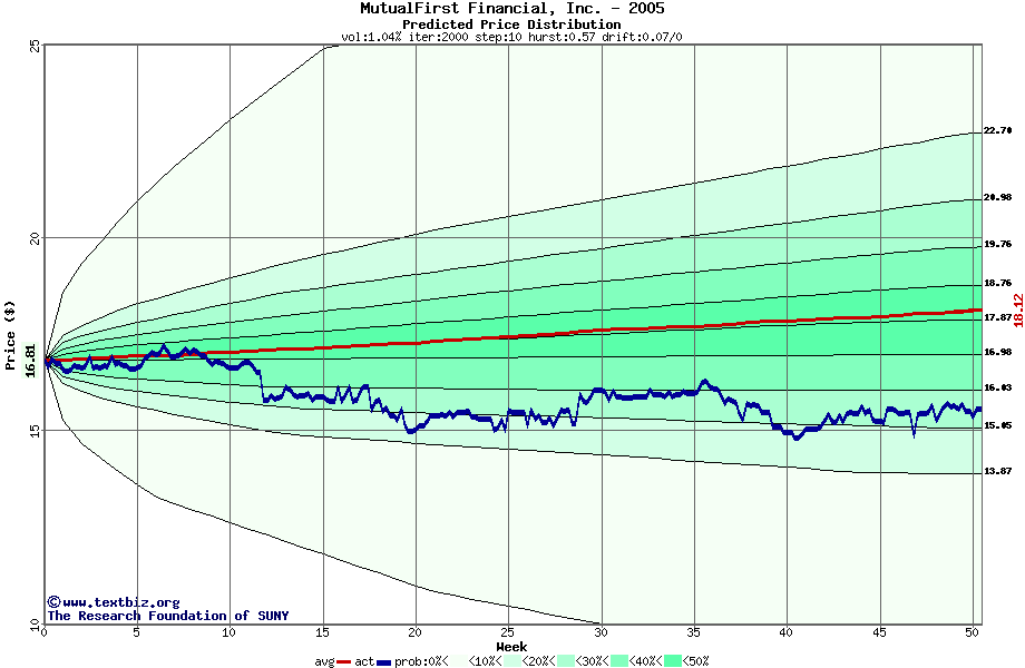 The following graph plots the year-to-date performance of the stock for 2005 compared to the probability calculated by a random walk model.