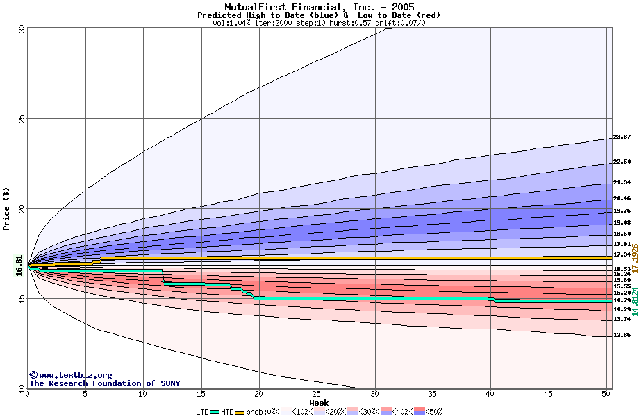 The high to date and low to date prices of the stock plotted against a random walk model for 2005 (what's this?).