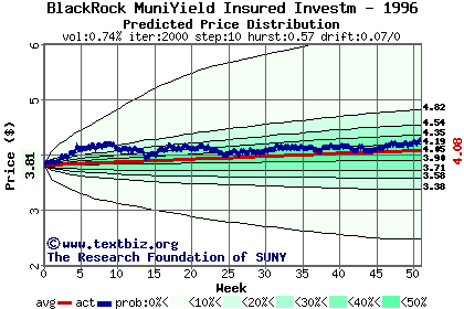 The high to date and low to date prices of the stock plotted against a random walk model for 1996 (what's this?).