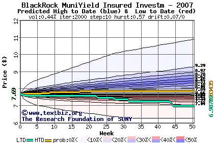 The high to date and low to date prices of the stock plotted against a random walk model for 2007 (what's this?).
