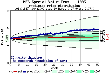 The high to date and low to date prices of the stock plotted against a random walk model for 1995 (what's this?).