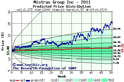 The high to date and low to date prices of the stock plotted against a random walk model for 2011 (what's this?).