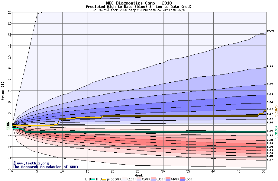 The high to date and low to date prices of the stock plotted against a random walk model for 2010 (what's this?).