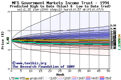 The high to date and low to date prices of the stock plotted against a random walk model for 1994 (what's this?).