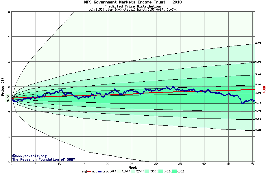 The high to date and low to date prices of the stock plotted against a random walk model for 2010 (what's this?).