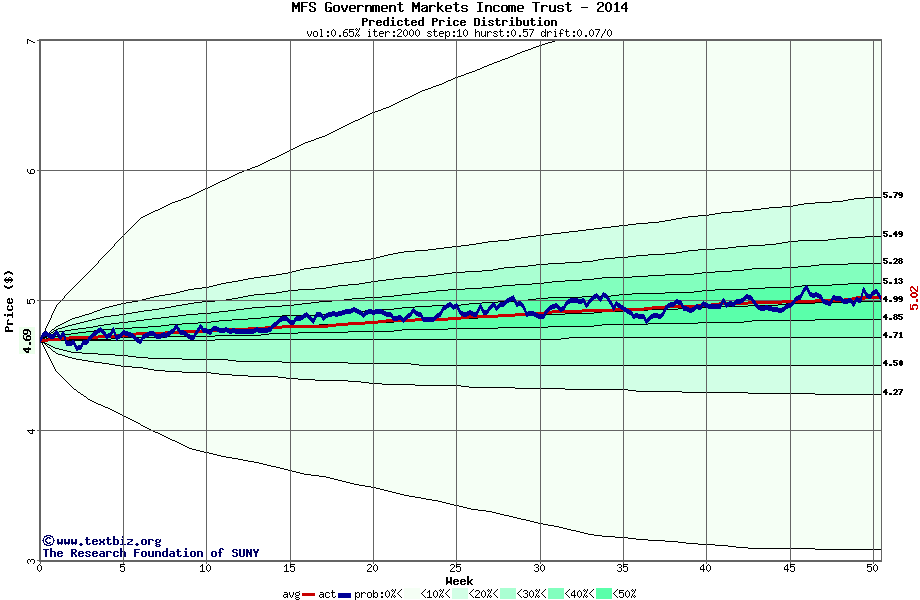 The high to date and low to date prices of the stock plotted against a random walk model for 2014 (what's this?).