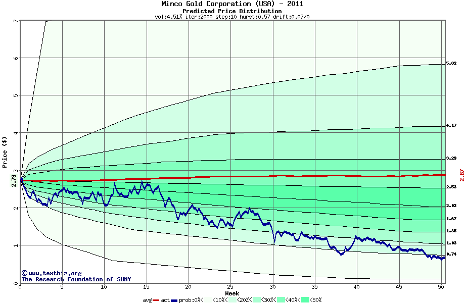 The high to date and low to date prices of the stock plotted against a random walk model for 2011 (what's this?).