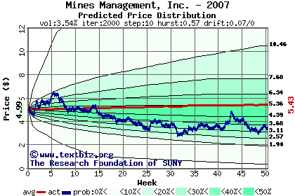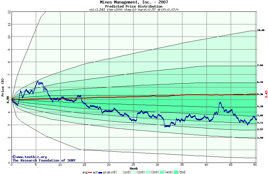 The high to date and low to date prices of the stock plotted against a random walk model for 2007 (what's this?).