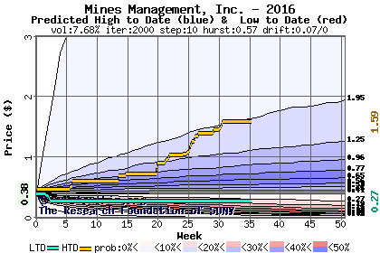 The high to date and low to date prices of the stock plotted against a random walk model for 2016 (what's this?).