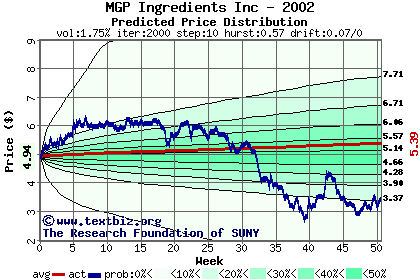 The high to date and low to date prices of the stock plotted against a random walk model for 2002 (what's this?).