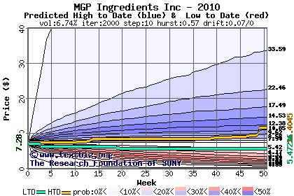 The high to date and low to date prices of the stock plotted against a random walk model for 2010 (what's this?).
