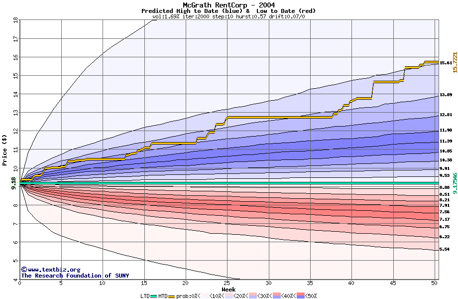 The high to date and low to date prices of the stock plotted against a random walk model for 2004 (what's this?).