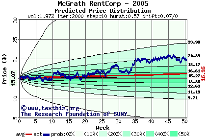The following graph plots the year-to-date performance of the stock for 2005 compared to the probability calculated by a random walk model.