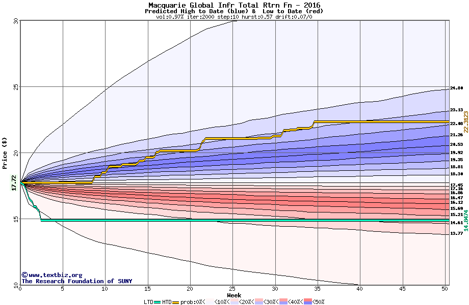 The high to date and low to date prices of the stock plotted against a random walk model for 2016 (what's this?).