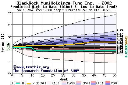 The high to date and low to date prices of the stock plotted against a random walk model for 2002 (what's this?).