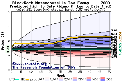 The high to date and low to date prices of the stock plotted against a random walk model for 2000 (what's this?).