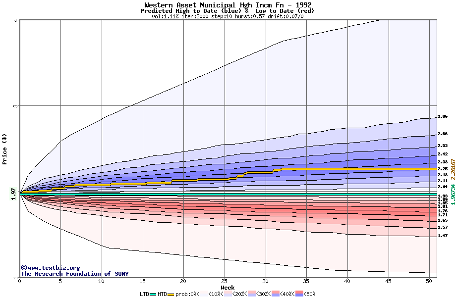 The high to date and low to date prices of the stock plotted against a random walk model for 1992 (what's this?).