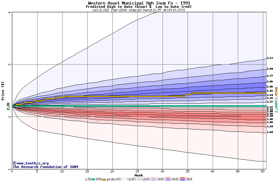 The high to date and low to date prices of the stock plotted against a random walk model for 1993 (what's this?).