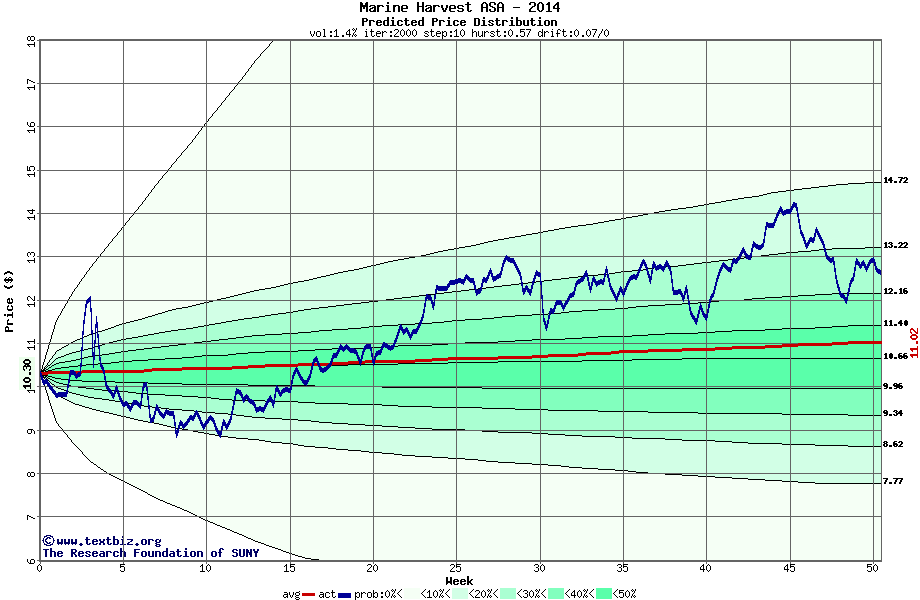The following graph plots the year-to-date performance of the stock for 2014 compared to the probability calculated by a random walk model.