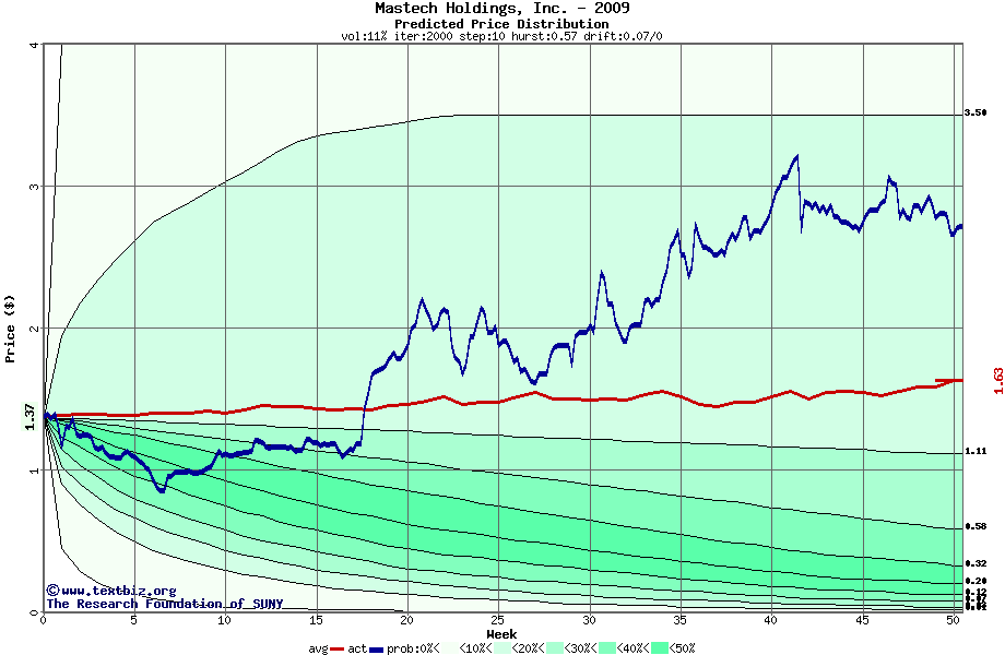 The following graph plots the year-to-date performance of the stock for 2009 compared to the probability calculated by a random walk model.