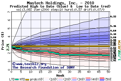 The high to date and low to date prices of the stock plotted against a random walk model for 2010 (what's this?).
