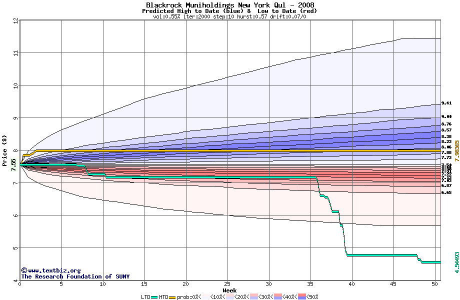 The high to date and low to date prices of the stock plotted against a random walk model for 2008 (what's this?).