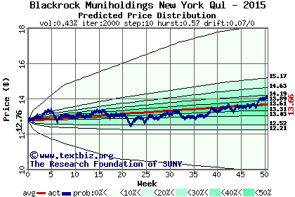 The high to date and low to date prices of the stock plotted against a random walk model for 2015 (what's this?).