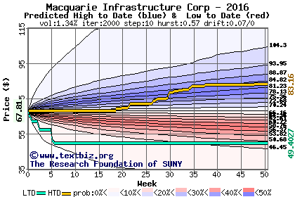 The high to date and low to date prices of the stock plotted against a random walk model for 2016 (what's this?).