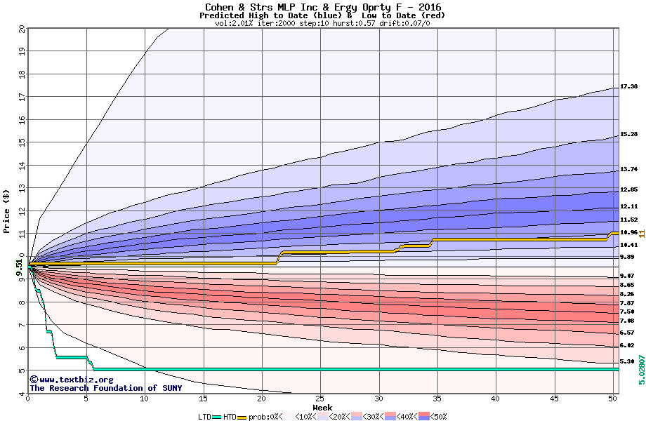 The high to date and low to date prices of the stock plotted against a random walk model for 2016 (what's this?).