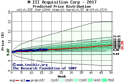 The high to date and low to date prices of the stock plotted against a random walk model for 2017 (what's this?).