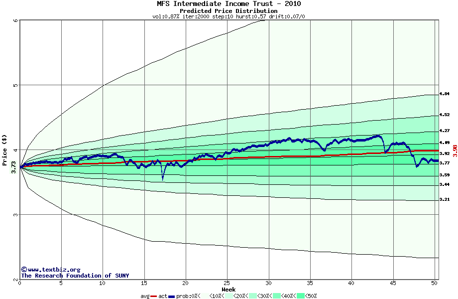 The high to date and low to date prices of the stock plotted against a random walk model for 2010 (what's this?).