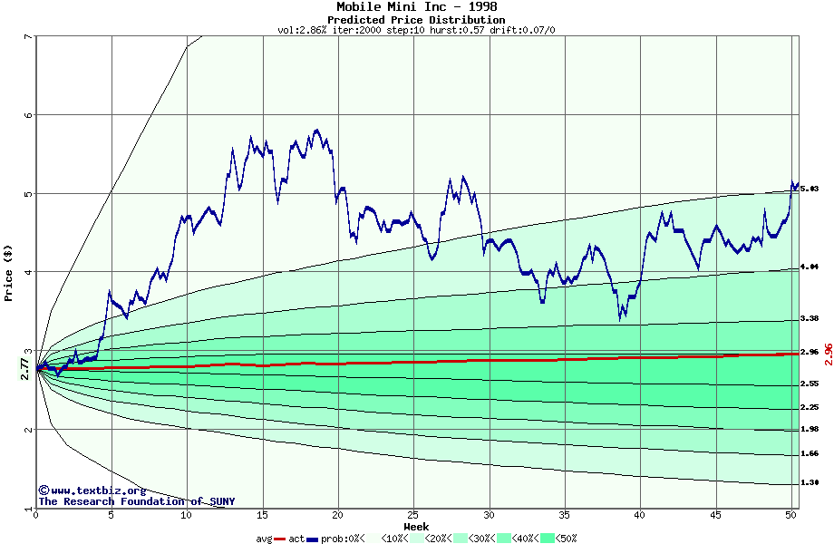 The following graph plots the year-to-date performance of the stock for 1998 compared to the probability calculated by a random walk model.