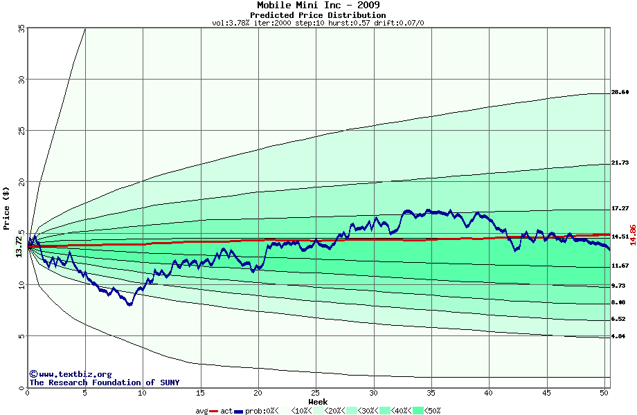 The following graph plots the year-to-date performance of the stock for 2009 compared to the probability calculated by a random walk model.