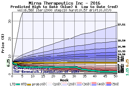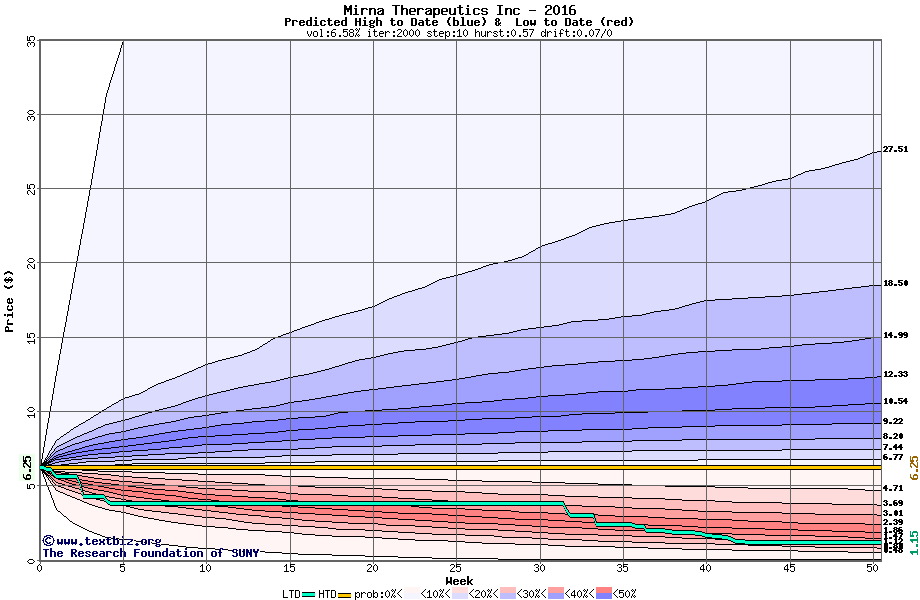 The high to date and low to date prices of the stock plotted against a random walk model for 2016 (what's this?).
