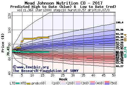 The high to date and low to date prices of the stock plotted against a random walk model for 2017 (what's this?).