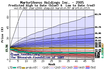 The high to date and low to date prices of the stock plotted against a random walk model for 2005 (what's this?).